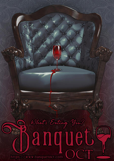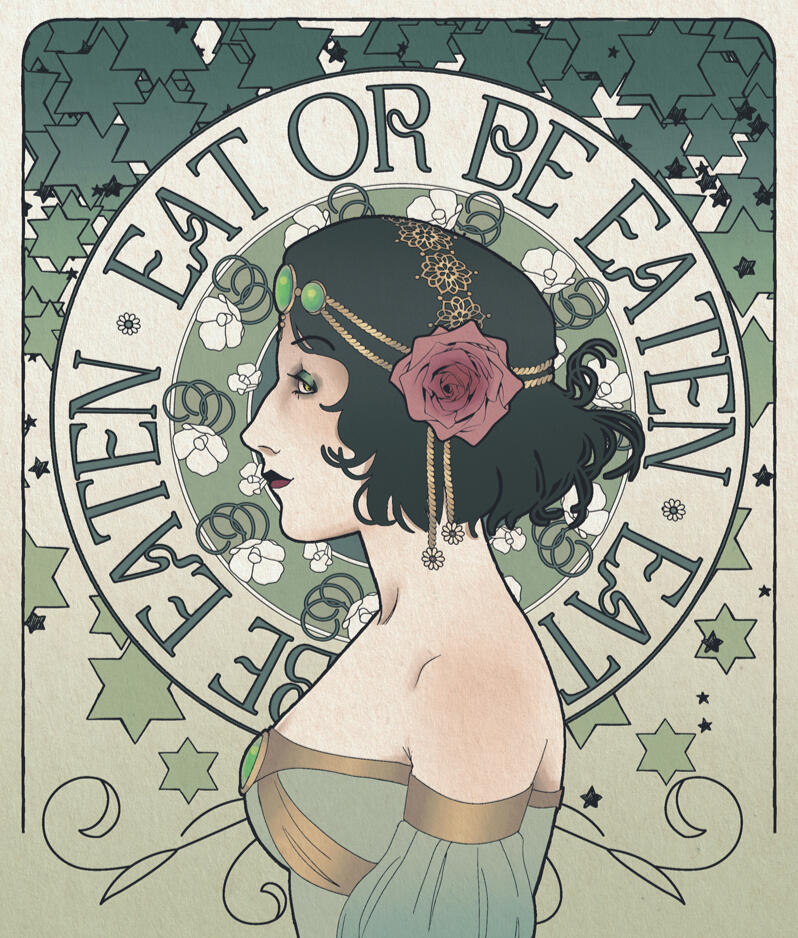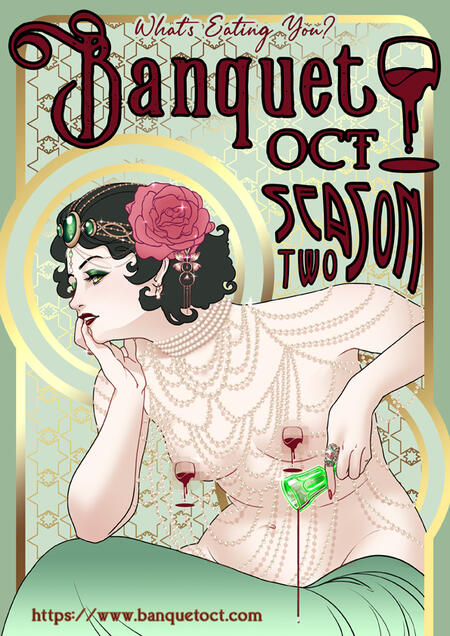 It was during the Belle Époque that the style of “New Art” emerged as a response to industrialization in the late 1800s. As objects were being manufactured for utility with little regard for craft or decoration, the movement sought to return grace and joie de vivre to all aspects of life, including architecture, furnishings, sculpture, and assorted visual arts. Art Nouveau was a wave of style that introduced elegance and flow to everyday objects, leaving behind in its wake a unique era of refined taste in both Western and Eastern worlds.A number of painters, sculptors, architects, and furniture designers found their roles within this niche art style, including Aubrey Beardsley, Gustav Klimt, Egon Schiele, Victor Horta, Émile Gallé, Louis Majorelle, and the epitomizing Alphonse Mucha, whose poster art is the most recognized imagery in the movement.Key earmarks of the style include vegetal design in the form of vines, leaves, and flowers, pioneered by William Morris, a master of wallpaper, printing, and book design. Smooth, elegant forms, ‘whiplash’ lines, asymmetry, breezy, organic shapes, curvy women, and natural subjects including the delicacy of insects and animals, dominate imagery and content within the style. On a technical level, figures and hair are treated with bold, toony strokes and outlines, leaving faces and interior shading light, minimalist, and delicate. Detailed interior linework is also lighter, but leaves the hair and clothing curiously flat while giving faces a more volumetric treatment. Hair specifically receives a more graphical approach as well, contrasting vividly against the softer shading but complementing bold graphical background and midground elements. Sculptural elements exercise both symmetry and asymmetry, cleaving to bold shapes but elegant lines, highlighting natural forms and materials while remaining light, airy, and organic.In celebration of the Art Nouveau style, BANQUET OCT seeks to apply these stylings to the HORROR genre, creating a unique ‘horror nouveau’. May our offerings please your palate for the elegant, nuanced, and deliciously refined gore and horror.